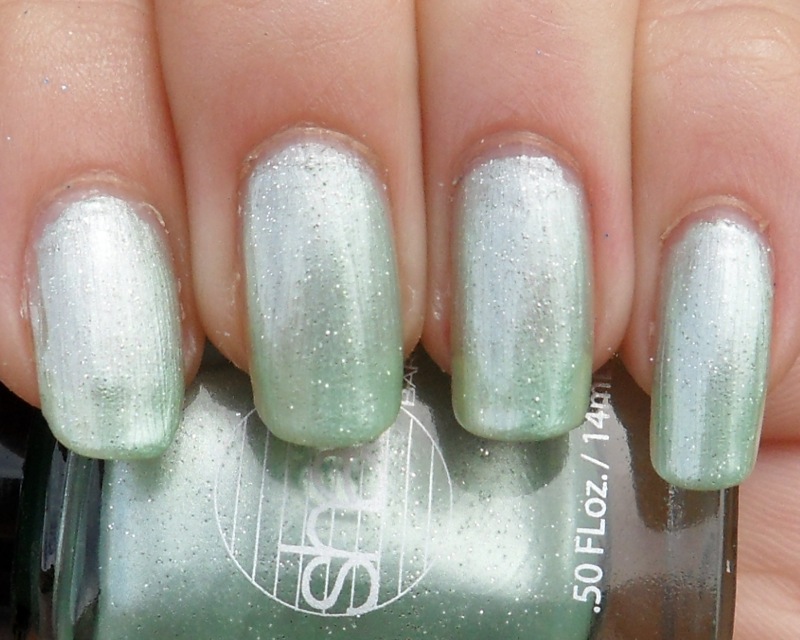 Argh, this reminds me of a polish but I can't remember which one. Possible a Missha one? This is the sort of polish that drives me nutty: metallic shimmer with glitter. Glitter gets swallowed up and just looks kinda lumpy. :( I like the base color a lot -- a very cool pale green -- but I'm not thrilled with the rest of the polish. Also, it's sheer and hard to apply evenly; the above shows three coats and it's still got bare patches.